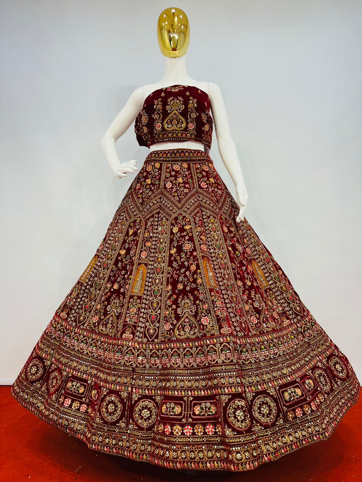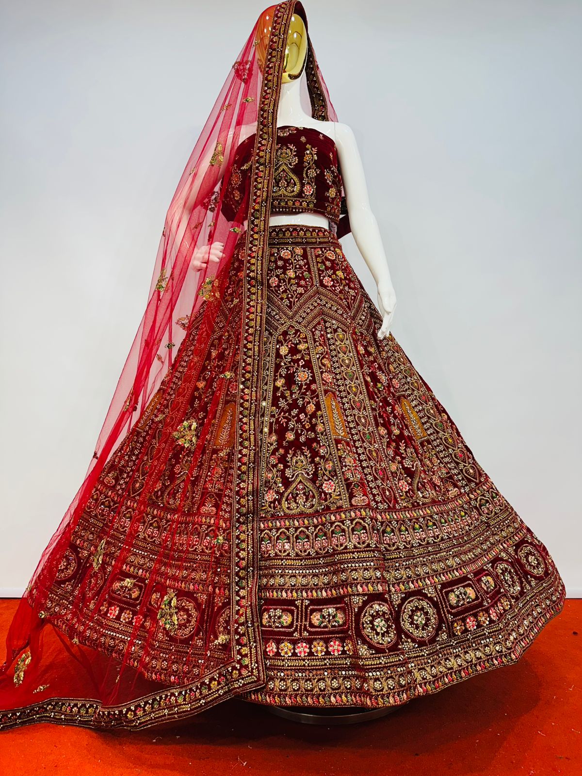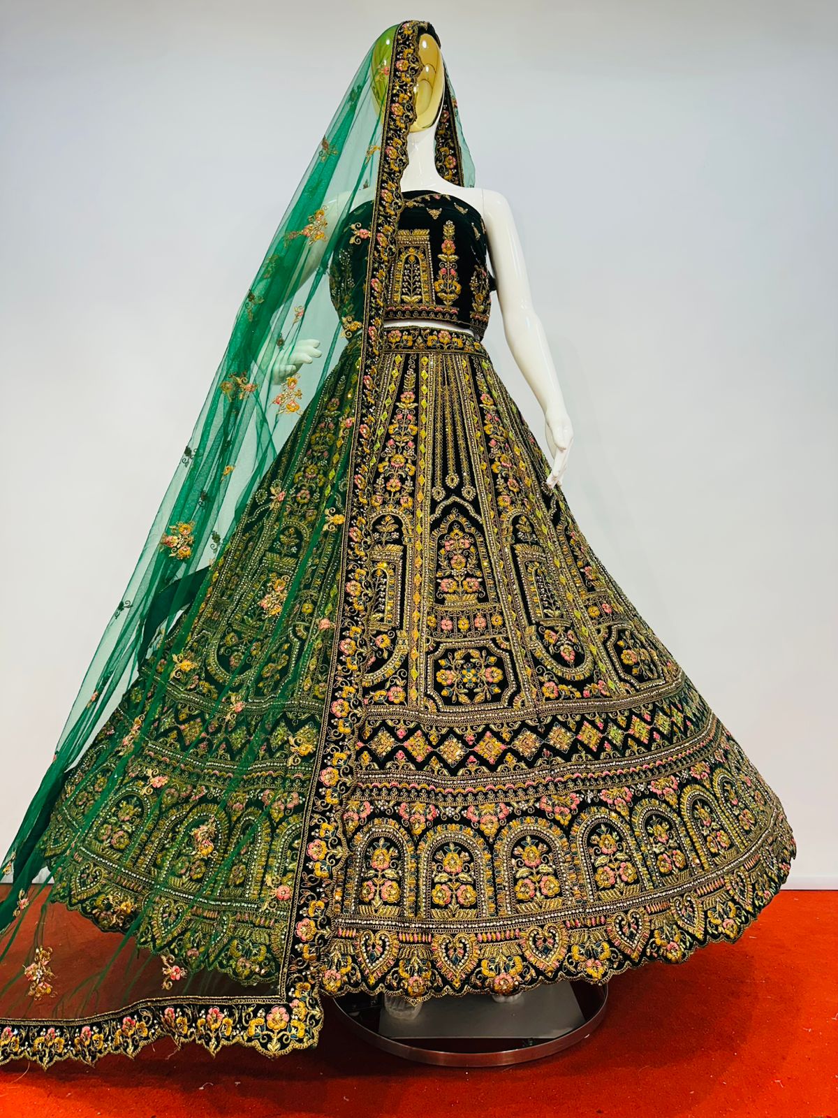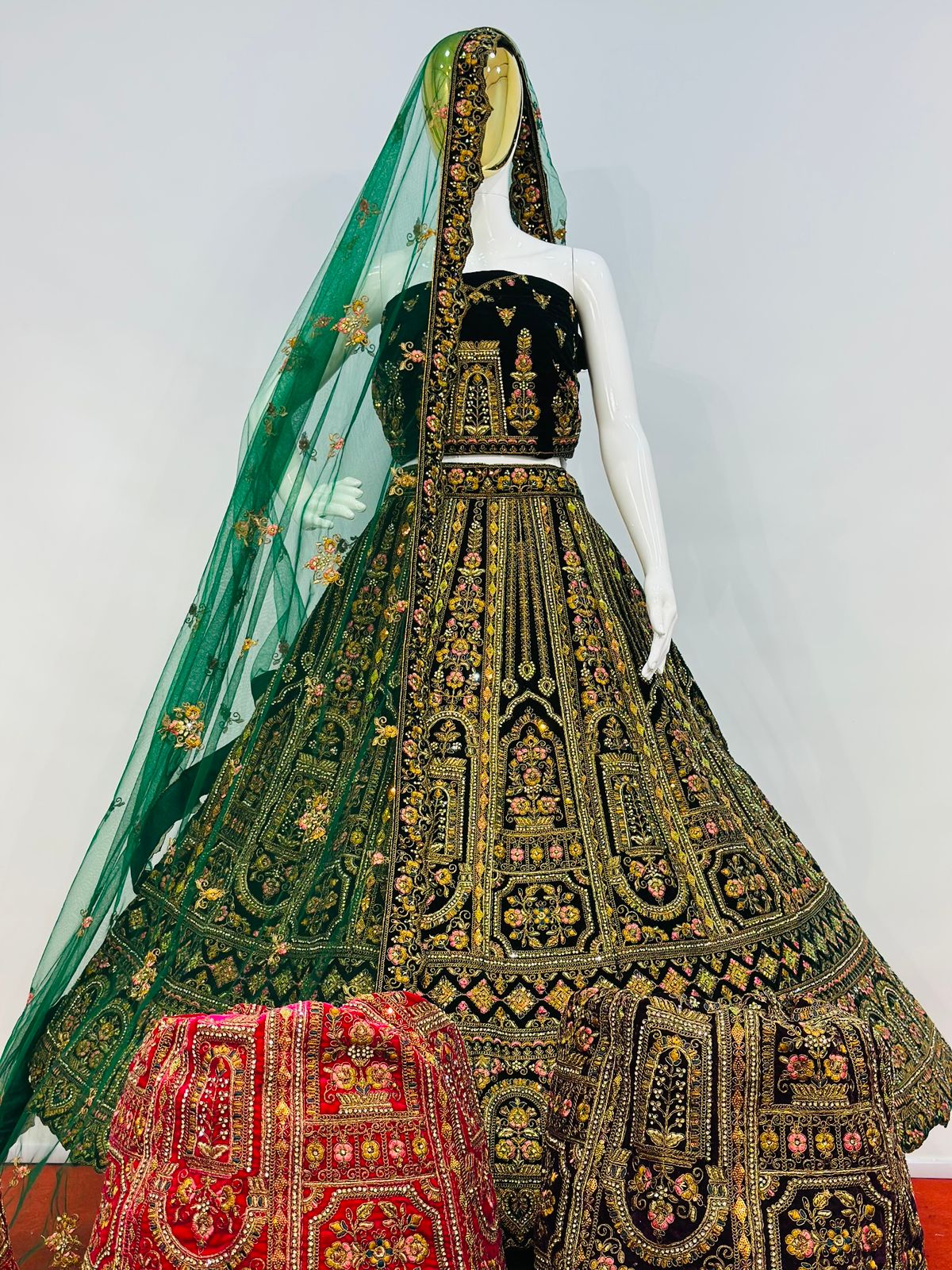 The lehenga showcases intricate multi-colour embroidery beautifully complemented by detailed cut work at the bottom, enhancing its grandeur and depth. Traditional motifs and ornate patterns are finely arranged throughout the skirt, giving it a truly majestic appeal. The matching velvet blouse fabric is equally adorned, making this ensemble perfect for weddings, receptions, festive occasions, and special celebrations.