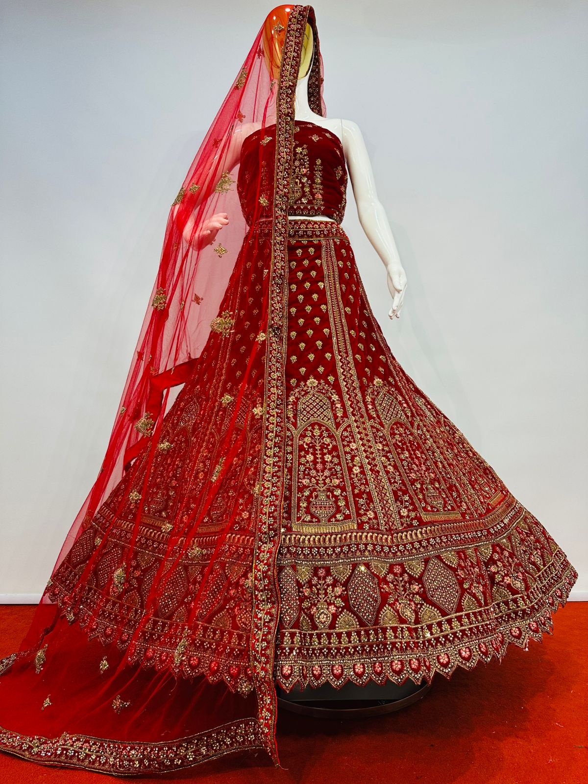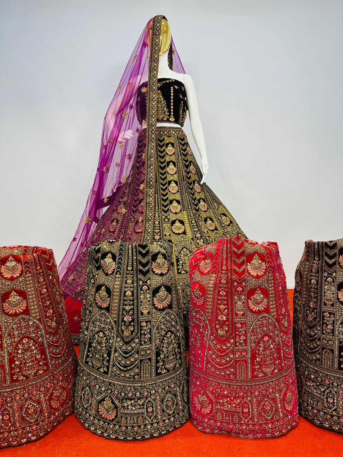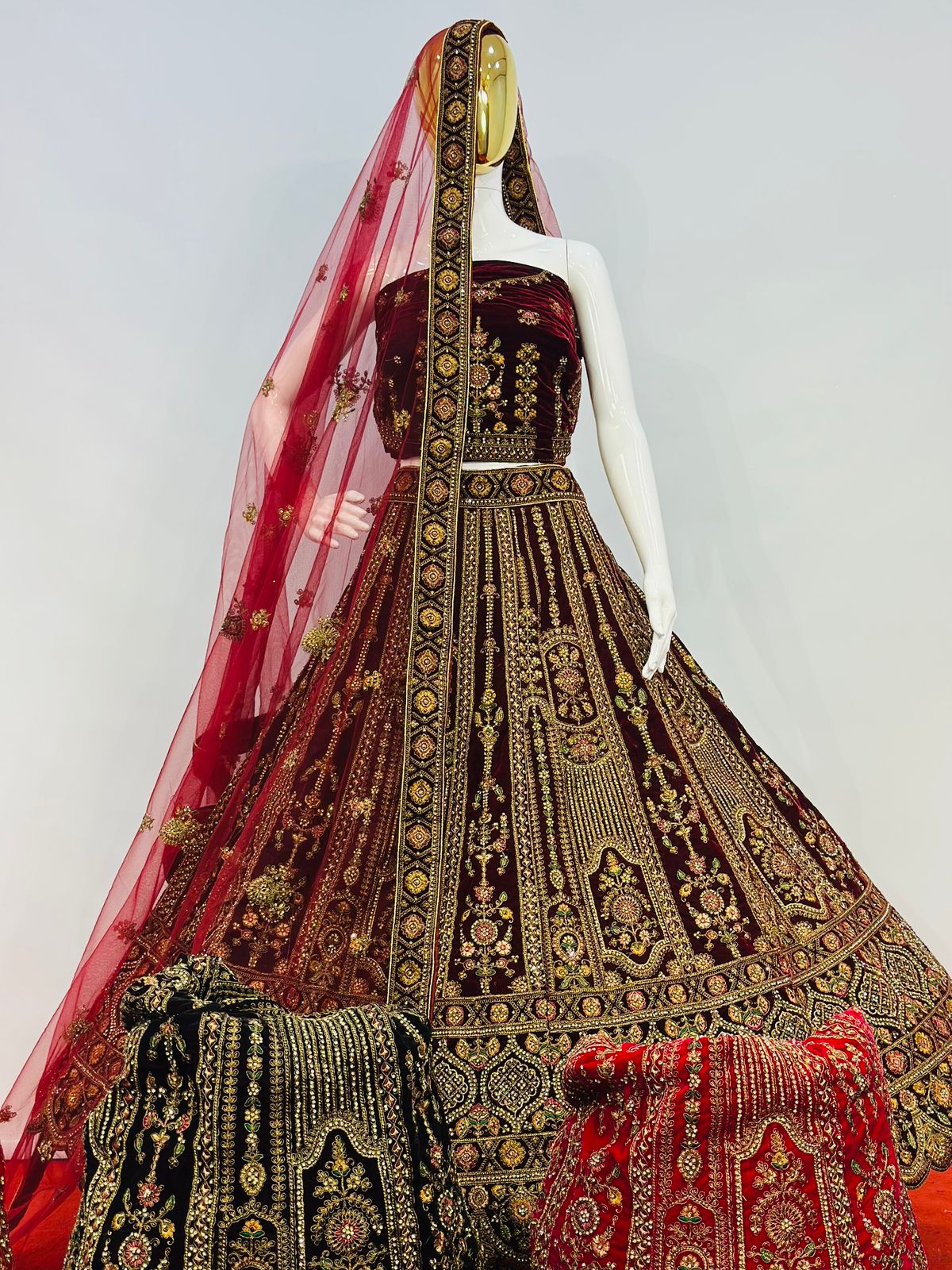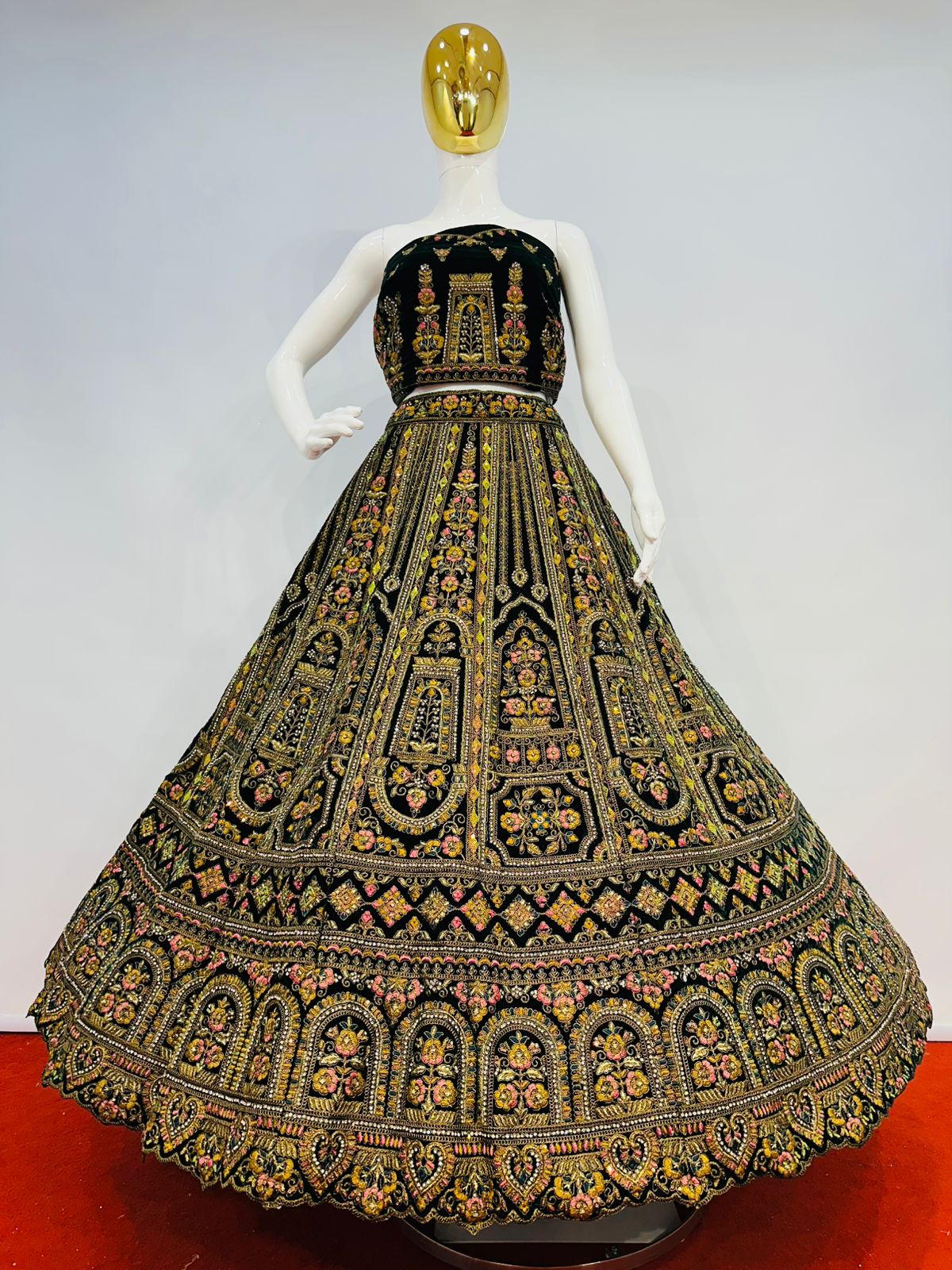 The lehenga showcases intricate multi-colour embroidery beautifully complemented by detailed cut work at the bottom, enhancing its grandeur and depth. Traditional motifs and ornate patterns are finely arranged throughout the skirt, giving it a truly majestic appeal. The matching velvet blouse fabric is equally adorned, making this ensemble perfect for weddings, receptions, festive occasions, and special celebrations.