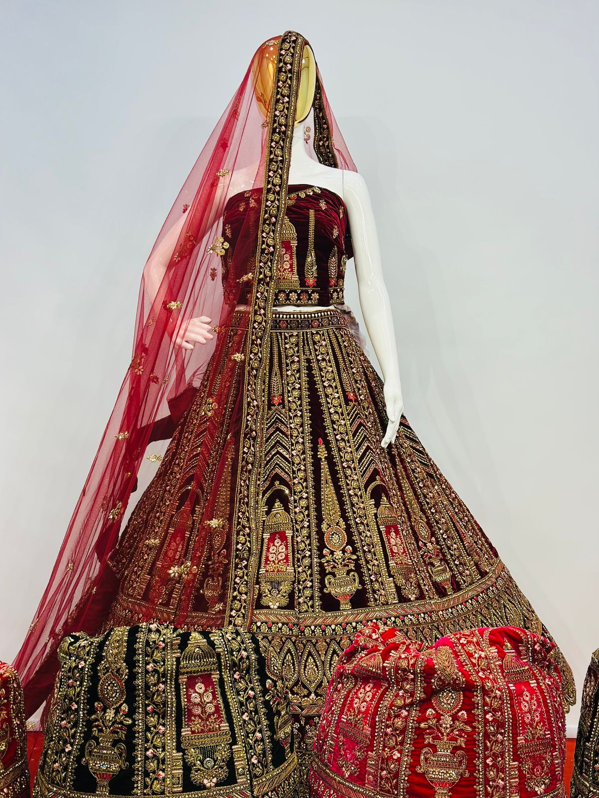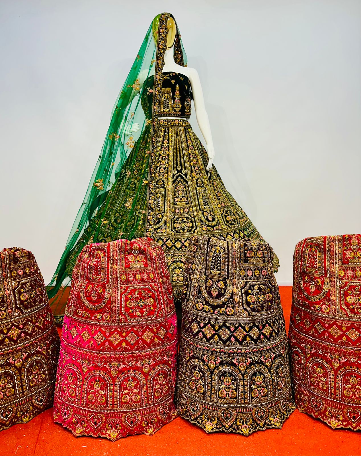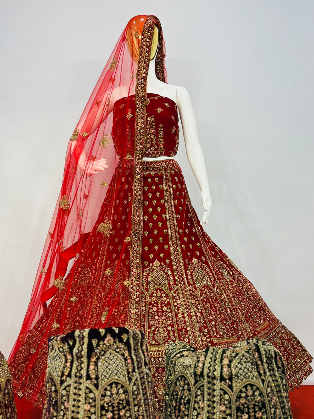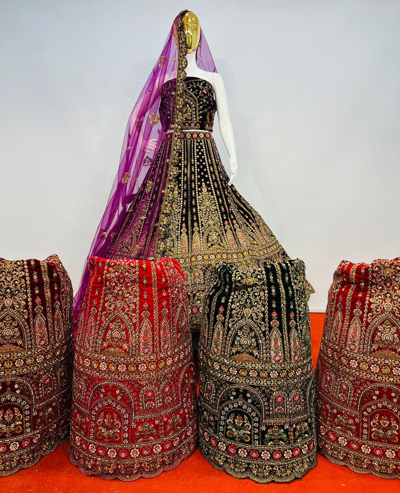 The lehenga showcases intricate multi-colour embroidery beautifully complemented by detailed cut work at the bottom, enhancing its grandeur and depth. Traditional motifs and ornate patterns are finely arranged throughout the skirt, giving it a truly majestic appeal. The matching velvet blouse fabric is equally adorned, making this ensemble perfect for weddings, receptions, festive occasions, and special celebrations.